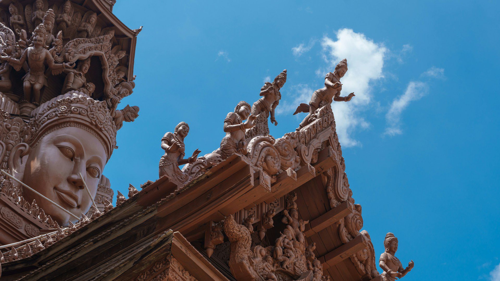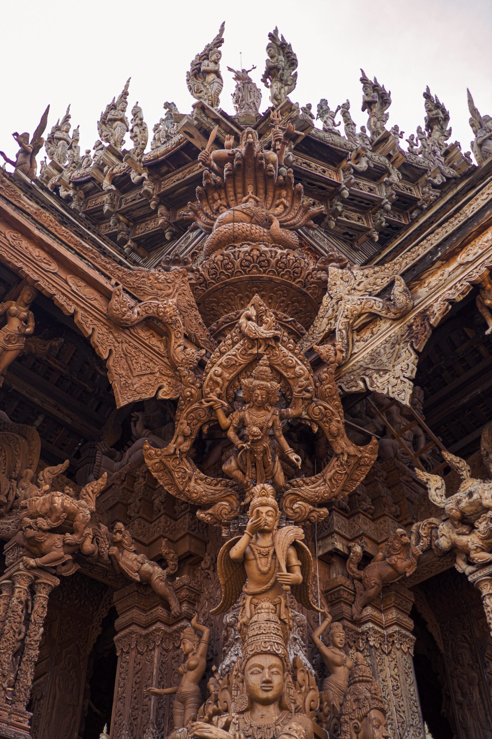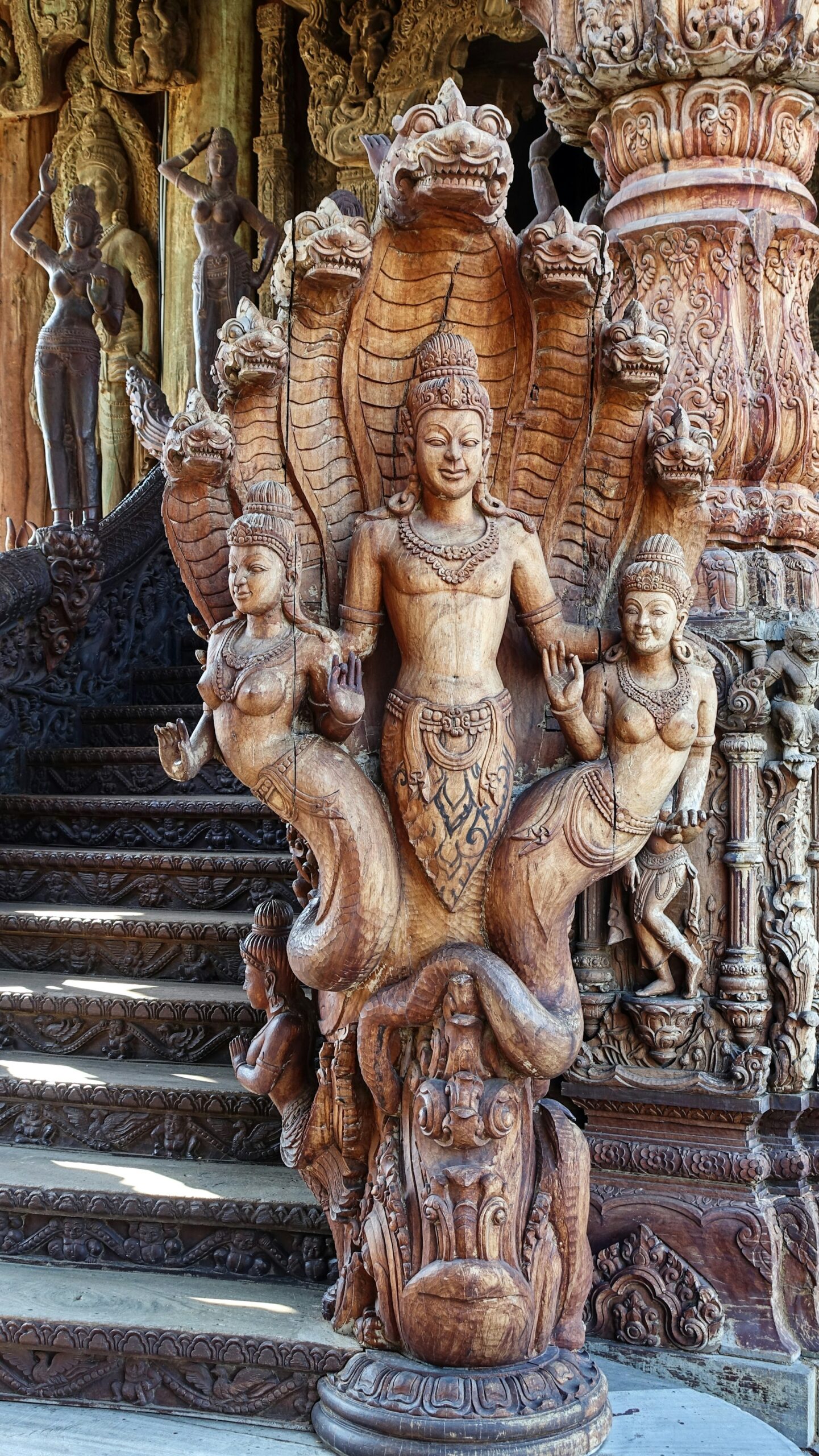 Даже если вы далеки от философии, что посмотреть в храме истины точно найдется. Просто прогуляйтесь по залам, разглядывая тысячи резных фигур. Детализация поражает: от гигантских многоголовых змеев Нагов до крошечных орнаментов на колоннах. Это настоящая энциклопедия восточной мифологии, вырезанная из дерева. Отзывы о Храме Истины всегда полны восхищения именно этой титанической работой.