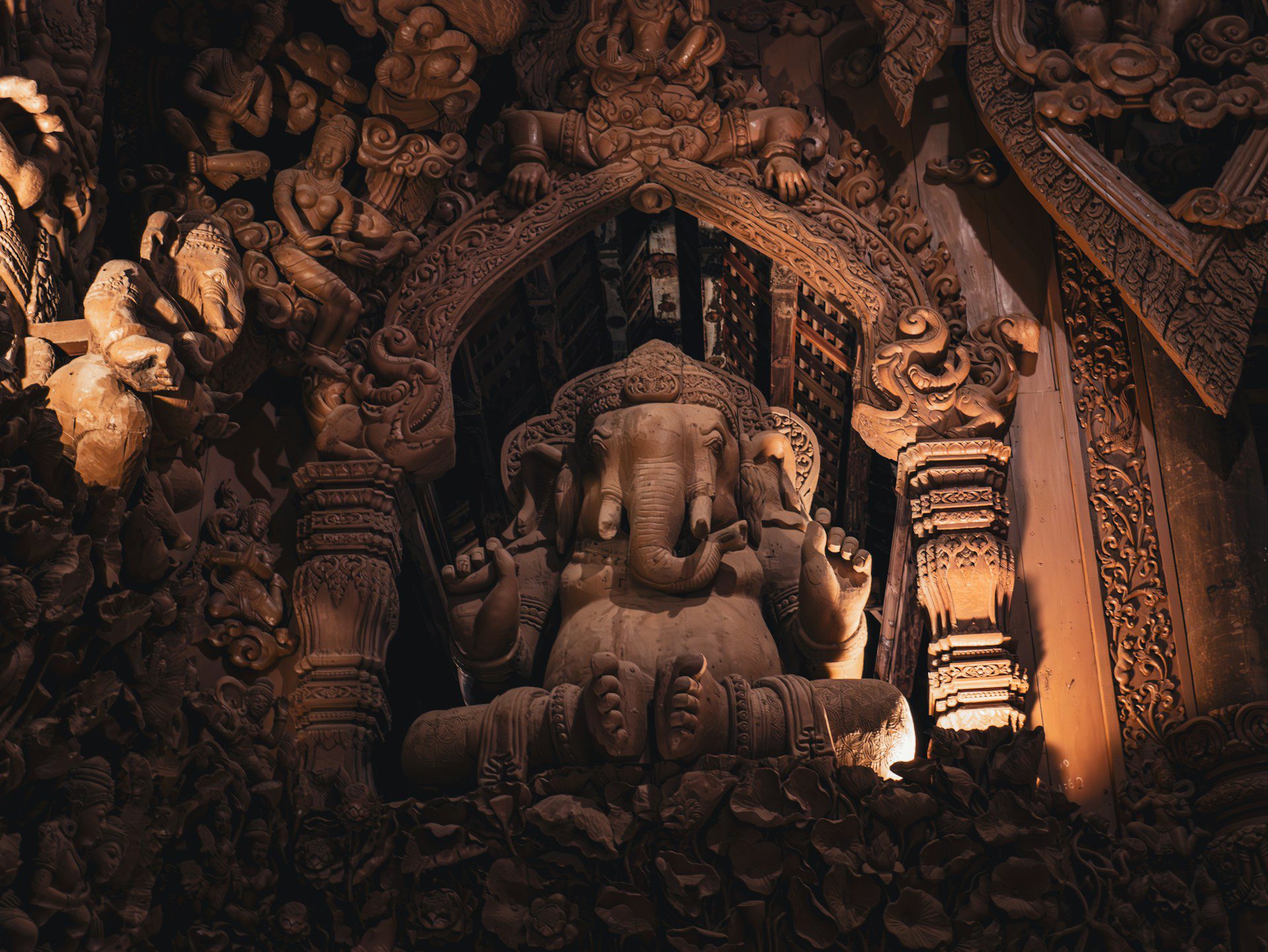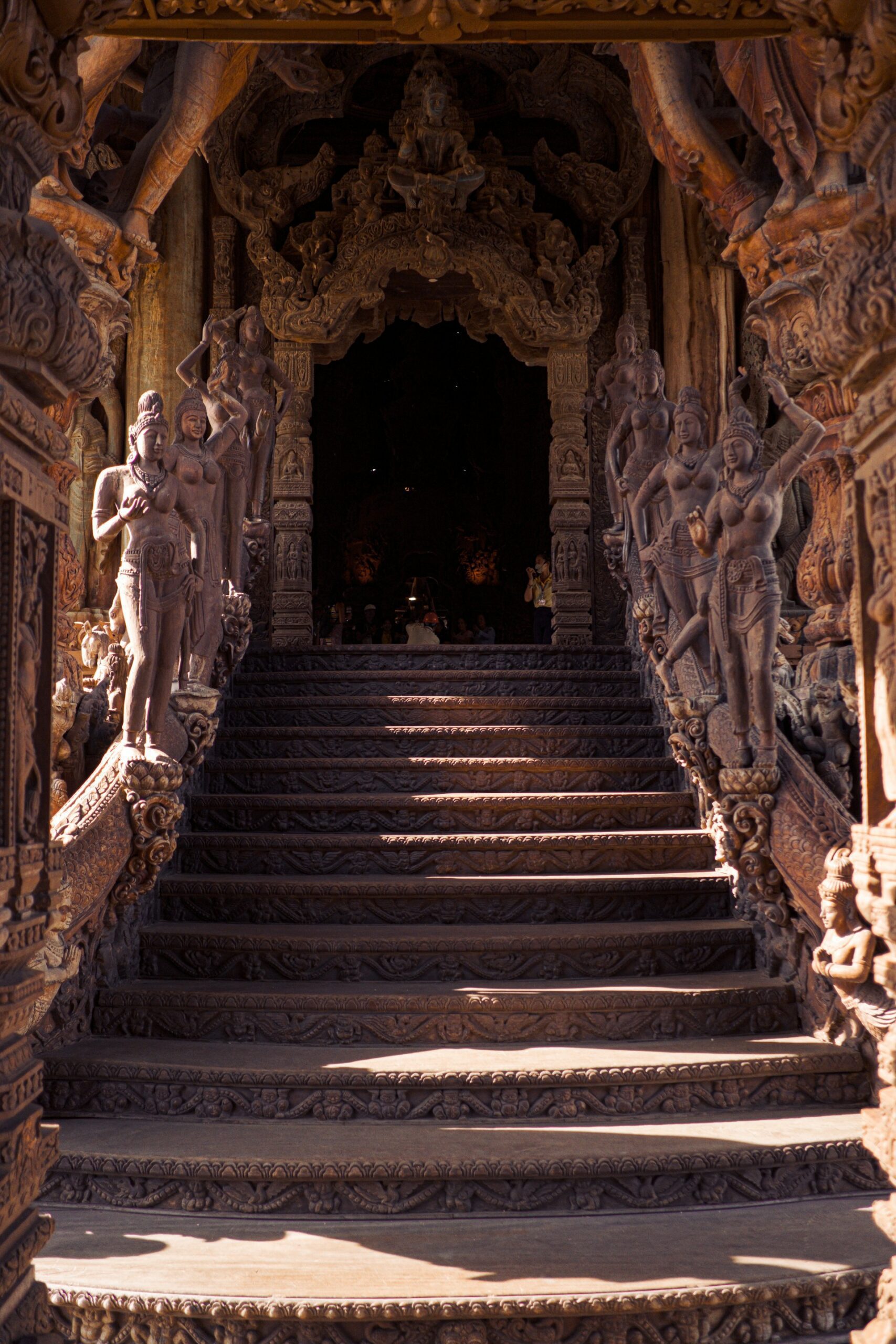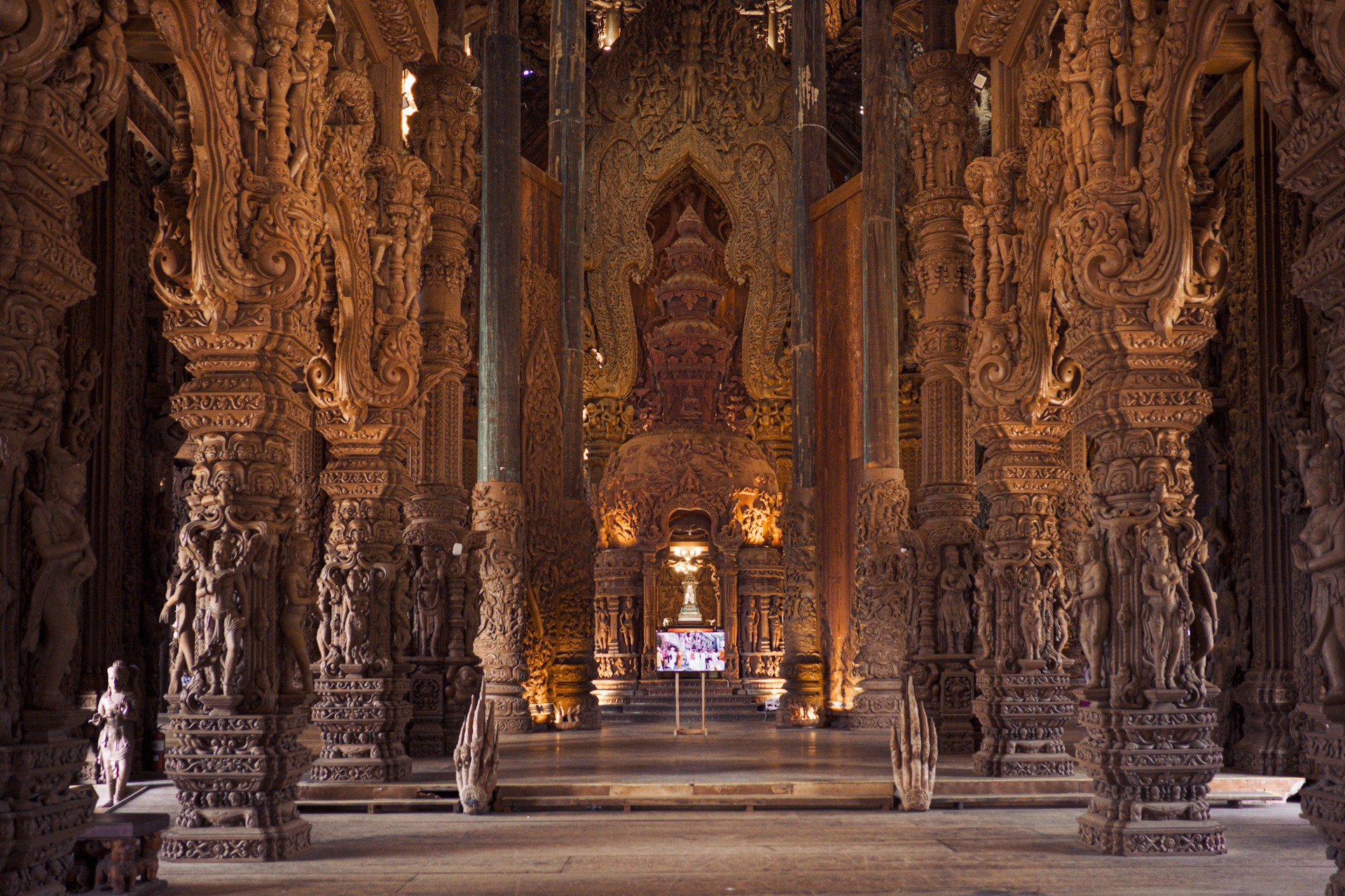 Даже если вы далеки от философии, что посмотреть в храме истины точно найдется. Просто прогуляйтесь по залам, разглядывая тысячи резных фигур. Детализация поражает: от гигантских многоголовых змеев Нагов до крошечных орнаментов на колоннах. Это настоящая энциклопедия восточной мифологии, вырезанная из дерева. Отзывы о Храме Истины всегда полны восхищения именно этой титанической работой.